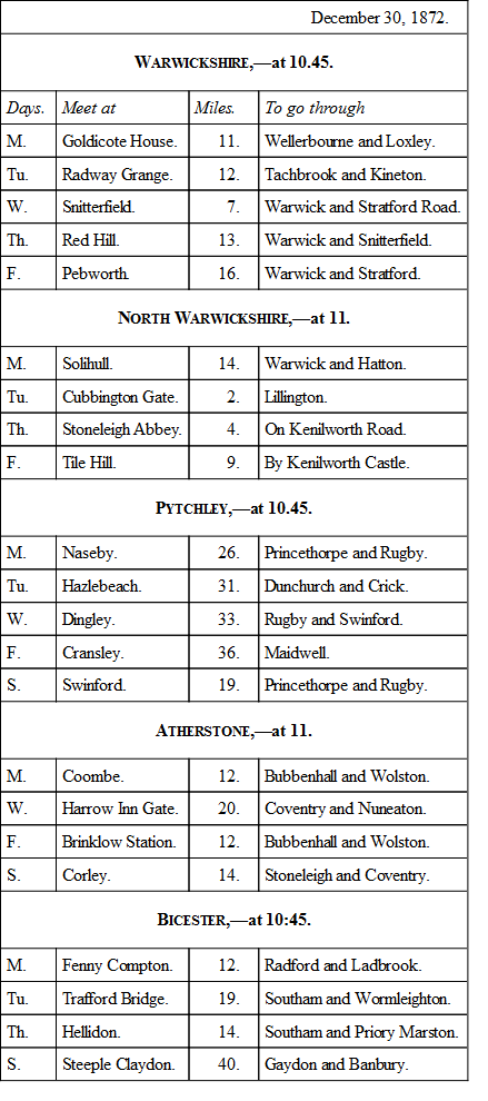 On entering the Regent Hotel at Leamington the first object that attracts attention, after the stuffy old porter who hobbles about to see some one else handle the luggage, is a small frame, over the smoking coal-fire, which contains the following notice, decorated with an old cut of a fox’s mask:—