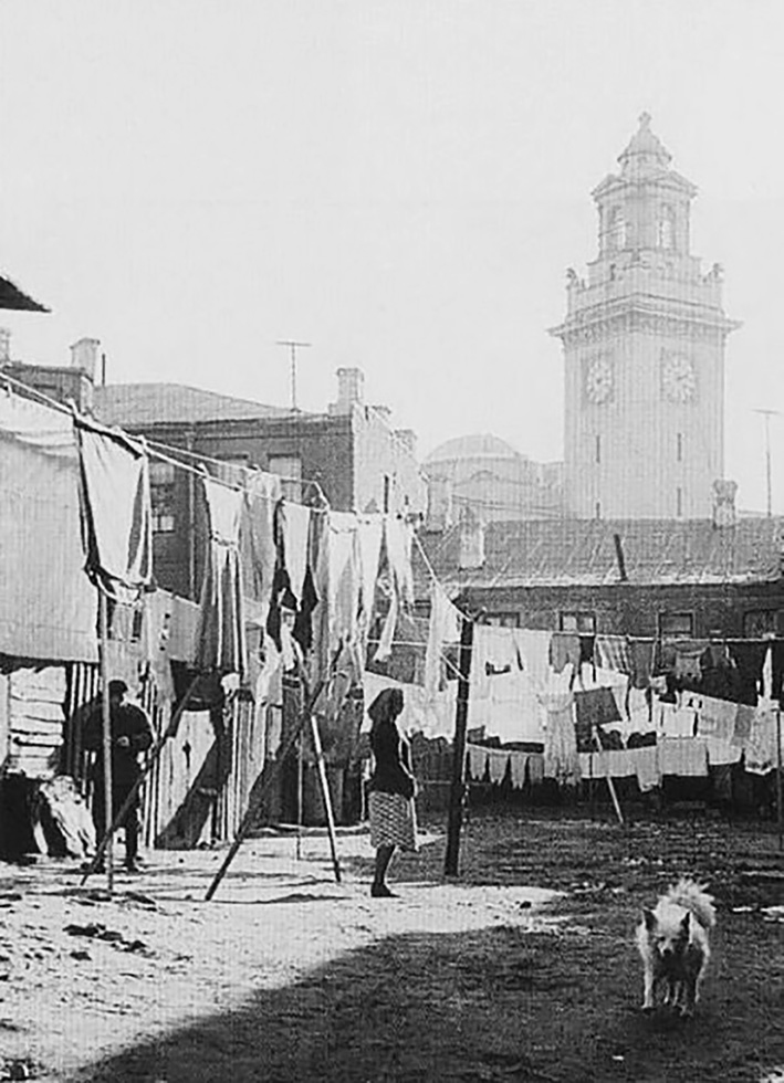 В районах деревянной и даже одно-двухэтажной каменной застройки подчас не было централизованной канализации. В укромном месте где-нибудь в конце двора существовало деревянное строение с выгребной ямой под ним. Так называемые золотарики14 приезжали время от времени и опускали в неё шланг для очистки. В такие моменты, как по мановению волшебной палочки, захлопывались все расположенные вблизи окна и форточки.