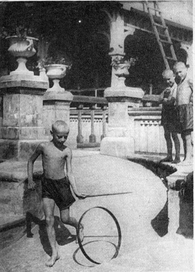 Пользовалась успехом игра в колёсико, которым служила обычно жестяная обечайка (обод), чаще от деревянной бочки (фото 34). Мальчишка бежал за колёсиком, удерживая и подталкивая его металлическим прутом. На всяких неровностях оно подпрыгивало, и выигравшим считался тот, кто пробежал более длинный путь без его падения.