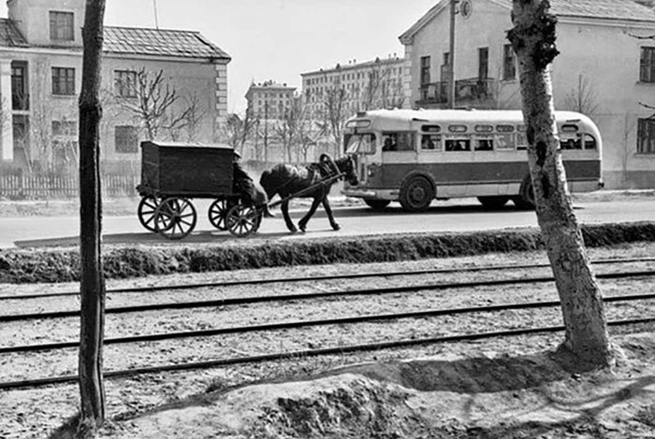 * * *В пору 50-х и даже 60-х годов в Москве существовал ещё «патриархальный» гужевой транспорт. Ломовые лошади использовались повсеместно для доставки продуктов в магазины. Везли картошку и капусту в рогожных мешках, деревянные конструкции с аккуратно расставленными в них буханками черного и батонами белого хлеба (фото 53), ящики с звенящими стеклянными бутылками молока или подсолнечного масла, бочки с солёными огурцами или помидорами. Мирно жующая лошадь обычно долго стояла при разгрузке, и, конечно, ну как не подойти и не погладить её холку и гриву. Лошадиный круп зачастую был влажным, и в нос шибало конским потом. Мостовые местами были усыпаны навозными «яблоками», за которые неистово дрались громко чирикающие воробьи. Их драчливые, крикливые весёлые стайки создавали неповторимый живой колорит московского быта.
