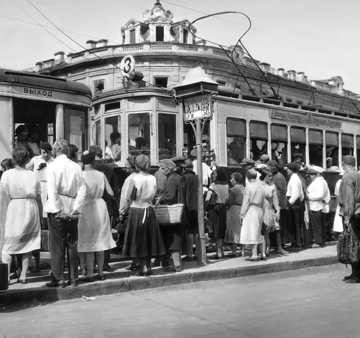 На каждом маршруте курсировали сцепки из моторного и одного или двух прицепных вагонов (фото 55). Помните у Барто? «До Зацепы мама водит два прицепа»16. Такие трамваи конструкции 1911 года эксплуатировались в Москве вплоть до 1970-х годов. Снаружи вагоны окрашены в два цвета, жёлтый верх, красный низ, и блестят, словно лаком покрытые. Никаких дверей на входе, только вертикальные поручни, держась за которые в дни массовых мероприятий пассажиры гроздями висели на ступеньках (фото 56).