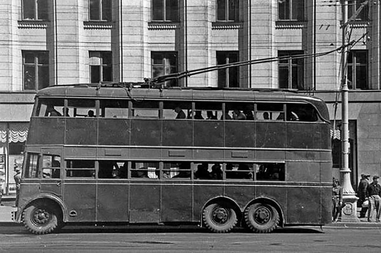 В 1932 году, когда был запущен троллейбус, существовало всего два маршрута. Троллейбусов в Москве было значительно меньше, чем трамваев, к ним никогда не цепляли прицепы, но в конце 40-х годов по улице Горького (ныне Тверской) ходили двухэтажные троллейбусы (фото 57). На второй этаж шла винтовая лестница. Пацанёнком я очень любил ездить на втором этаже у лобового стекла.