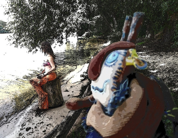 Лодочку подхватило течение. Квакахрям был очень счастлив! Он изо всех сил махал лапами прекрасной незнакомке, пока не услышал за спиной какое-то шипение. Оглянувшись, он увидел, что веревка распалась на множество черных змей, которые расползаются в разные стороны. Удивившись, Квакахрям посмотрел вслед уплывающей лодке. Тут девушка как раз взмахнула веслом и посмотрела назад. Квакахрям похолодел. Злая Волшебница!