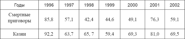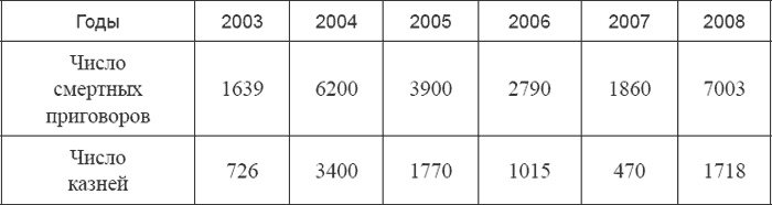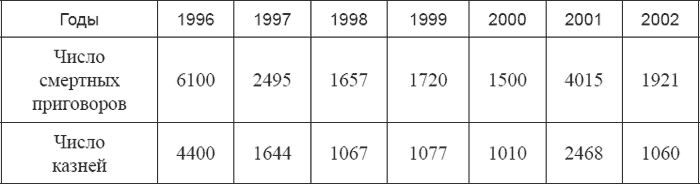 Разумеется, здесь приводятся лишь данные, зафиксированные правозащитными организациями, хотя, по мнению экспертов, данные о казнях в КНР за 1996–2000 годы занижены в три-четыре раза. Такие оценки, скорее всего, справедливы; иногда это подтверждают и высокопоставленные китайские официальные лица, не называющие своего имени. Понятно, что вовсе не случайно данные о применении смертной казни составляют в Китае государственную тайну, несмотря на то, что ч. 2 ст. 212 УПК КНР предусматривает обязательную публикацию сообщений об исполнении смертного приговора.