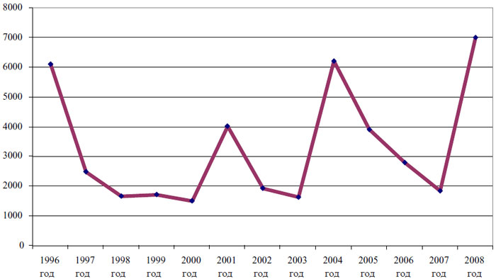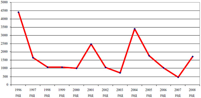 Рис. 1. Динамика смертных приговоров в КНР в 1996–2008 гг.