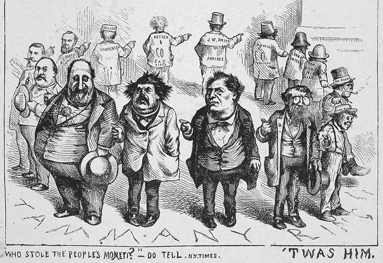 В крупных городах доминирующую роль играли партийные «политические машины» и их боссы. Так, поистине легендарным было влияние на политическую жизнь Нью-Йорка партийного босса демократов Уильяма Твида (1823–1878), вокруг которого сформировалась мощная система клиентелизма, взяточничества и даже организованной преступности – «шайка Твида». Добившись в годы Гражданской войны практически неограниченного контроля над городской штаб-квартирой Демократической партии – Таммани-Холлом, – Твид за счет манипуляций с подрядами, многократного завышения сметной стоимости объектов строительства, финансируемых городом и штатом Нью-Йорк, прямого казнокрадства сколотил огромное состояние, а общий объем аккумулированных «шайкой Твида» средств превышал размер внешнего долга США к исходу Гражданской войны. В результате разоблачения со стороны одного из немногих неконтролируемых им изданий, Твид был арестован в 1873 г., но бежал из-под ареста и сумел добраться до Испании. Однако испанское правительство выдало беглеца американским властям. Вплоть до своей смерти от пневмонии он содержался в нью-йоркской тюрьме Ладлоу, на подрядах на строительство которой он ранее неплохо нажился.