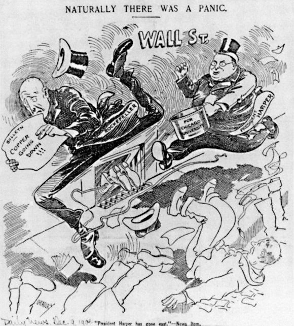 «Естественно, это была паника». Дж. Рокфеллер, убегающий от У. Харпера, требующего очередного взноса в университетский эндаумент. Карикатура в Chicago Daily News (04.12.1904)