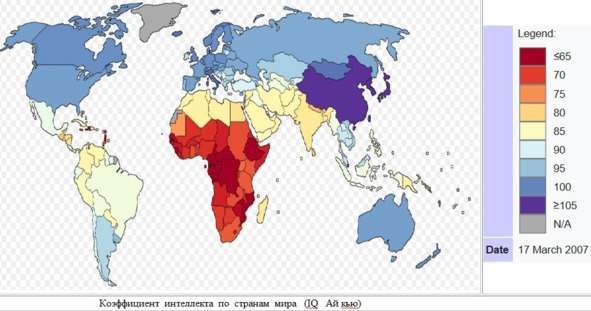Considering the above map, we notice that the most intelligent creature Homo sapiens came from Africa, the continent with the lowest level of intelligence today. Coming out of there, it «grew wiser», evolving in the vastness of Europe and Asia.