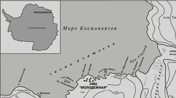 Столица антарктических станций«Молодежная» (67°40 ю.ш. 45°50» в.д., 42 м над уровнем моря). Советский антарктический метеорологический центр «Молодежная» находится в западной части Земли Эндерби на берегу залива Алашеева (море Космонавтов). Поселок расположен в небольшом прибрежном оазисе (холмы Тала) в 0,5—0,6 км от берега. Оазис представляет собой холмистую местность с грядами свободных ото льда и снега скальных пород, разобщенных заснеженными впадинами. К югу от поселка поверхность ледника повышается, и уже на расстоянии 10 км. высота ее достигает 500 м. с лишним, образуя Невские горы. Климат в районе «Молодежной», суровый арктический, отличается отрицательными температурами воздуха в течение почти всего года, а также сильными и частыми ветрами. Температуры воз духа: средняя годовая -11°, максимальная +8,5°, минимальная – 42°. Море Космонавтов в районе «Молодежной» большую часть года покрыто льдом. Много айсбергов. Ширина припая к концу зимы достигает почти 100 км. Полярная ночь длится полмесяца, с 15 по 30 июня, а полярный день – почти полтора месяца, с начала декабря по середину января. Строительство «Молодежной» началось 23 февраля 1962 г. Однако в первый год не удалось обеспечить станцию всем необходимым для зимовки и 31 марта она была законсервирована. Строительство станции и научные наблюдения были возобновлены 4 января 1963 г. В 1990-е годы в районе станции производились некоторые научные исследования и природоохранные мероприятия по выполнению требований Протокола по охране окружающей среды к Договору об Антарктике. Станция законсервирована в 1999 году: 9 июля на станции был спущен российский флаг. В феврале 2006 года руководитель Российской антарктической экспедиции (РАЭ) Валерий Лукин заявил: «Планируется открыть ранее законсервированные станции «Молодёжная», «Ленинградская» и «Русская» в сезоне 2007—2008 годов. Это принесет большую пользу, поскольку эти станции находятся в Тихоокеанском секторе Антарктики, который мало охвачен научными исследованиями». С 2006 года вместе с российскими полярниками здесь работала Белорусская антарктическая экспедиция. В марте 2013 года здесь работало 16 российских полярников и 3 белорусских. Первоначально белорусские полярники жили и работали в 18 км от станции «Молодежная», в районе г. Вечерняя в старых постройках времён СССР. В 2016 году 8-й Белорусской антарктической экспедицией в том же месте были построены жилые модули. В настоящий момент белорусская станция Гора Вечерняя является самостоятельной и ближайшей к станции «Молодежная» полярной станцией.