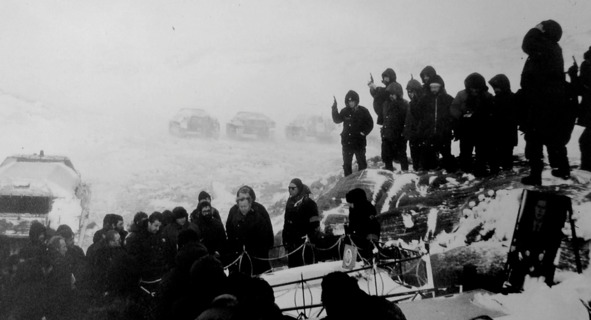 В 1400 у кают-компании, несмотря на жестокую метель, состоялась гражданская панихида. В гробу лежал человек с рыжей бородой и необыкновенно худыми руками и огромными ладонями. Снег запорошил ему лицо. Мы стояли вокруг с непокрытыми головами. И каждый думал что-то свое. После коротких выступлений близких товарищей закрытый гроб погрузили на вездеход, все провожающие сели в другие машины и печальная колонна отправилась на мыс Гранат, где находилось кладбище. Здесь, на высоком берегу моря Космонавтов гроб с телом покойного был заключен в металлический саркофаг и обложен камнями. Земли в нашем понимании в каменистом оазисе нет и могилу вырыть невозможно – кругом твердый скальный грунт. Таким образом здесь похоронены и другие: Артемьев – начальник 28 CАЭ, летчики разбившегося самолета и другие – всего девять могил.