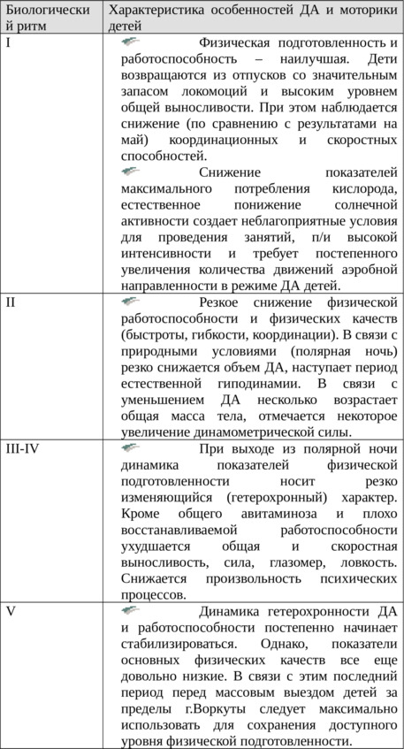 – Ориентация деятельности при разработке модели двигательного режима детей дошкольного возраста на особенности природно-климатических условий Крайнего Севера и биологических (сезонных) ритмов года.