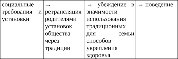 Эмоциональное отношение определяется наиболее очевидными убеждениями о последствиях поведения и может рассматриваться с точки зрения позитивных и негативных установок («Занятия физкультурой и спортом способствуют укреплению здоровья» или «Болеют все без исключения, независимо от физической подготовленности и закаленности»). Осознание значимости проблемы сохранения и укрепления здоровья – это совокупность требований к поведению, убеждение в необходимости действовать, обоснование содержания традиции. Выбор действий адаптирует содержание традиции применительно возможностям семьи, конкретным обстоятельствам повседневной жизни, а также создает предпосылку к появлению новых традиций.