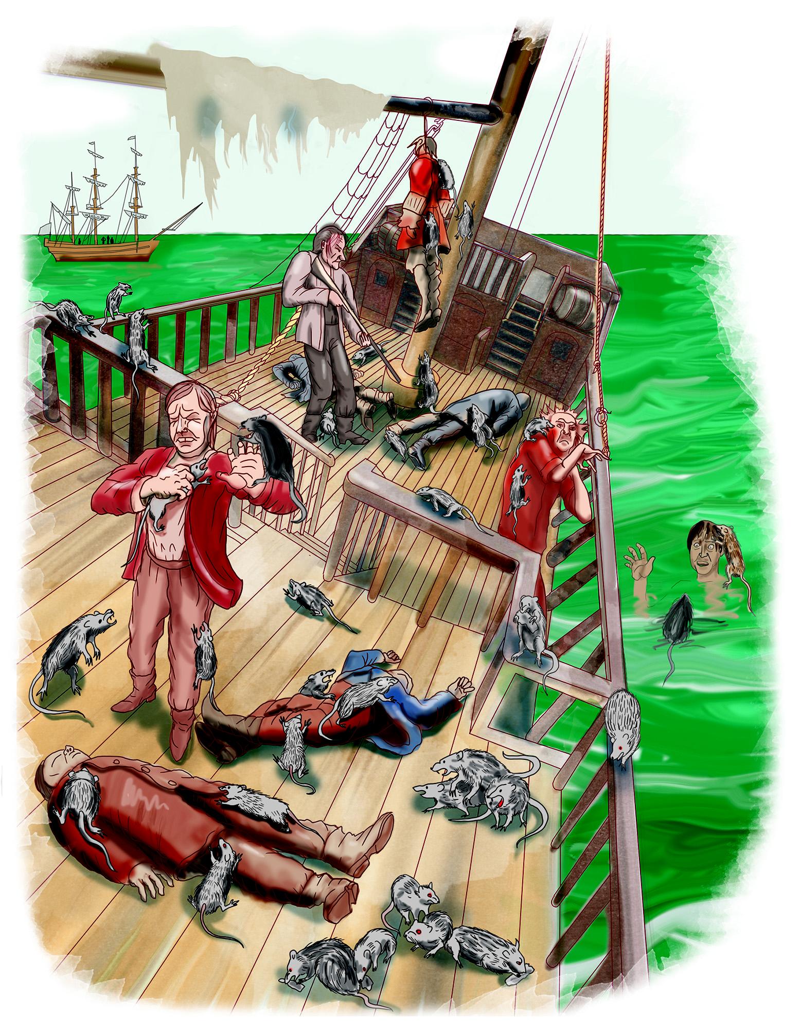 К удивлению экипажа корабля, крысы стали ловко и быстро взбираться по борту «Спая». Капитан Найт скомандовал: «Аврал!», то есть вызвал всех на палубу, и приказал матросам внимательно следить, чтобы ни одна из тварей не взобралась на палубу. Матросы вооружились лопатами и палками и принялись сбрасывать крыс с борта назад в море. Но их оказалось очень много, и они беспрерывно лезли на корабль. Когда спохватились, что в нескольких каютах оставлены приоткрытыми иллюминаторы, было уже поздно. Нескольким крысам удалось проникнуть на «Спай».