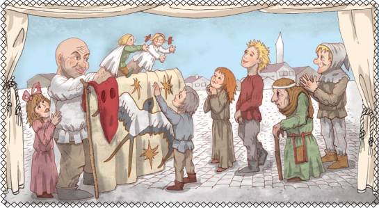 На представления к Бартоломосу ходил весь город. На Ратушной площади он ставил ширму, которую специально для его театра сшила фрау Адалинда, накрывал её сукном и начинал показывать свои сказки. Помогала ему в этом Агнесс. За ширмой она подавала ему кукол, говорила их голосом, а в конце представления собирала монетки у зрителей.