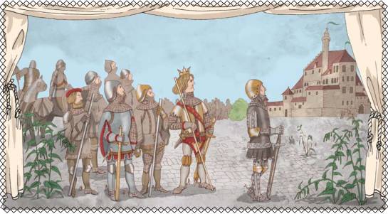 И вот три воинственных короля со своими войсками сошлись у вольного города Киля. У городских ворот их ожидала принцесса Альбертина. За её спиной стояли министр Олдрик, стражник Йохан, трактирщик Ральф и монах Родерик. А за ними собрались все горожане, которые испуганно смотрели на многочисленных рыцарей, готовых напасть на вольный город Киль. Войска у трёх воинственных королей были большие, а город Киль маленький.