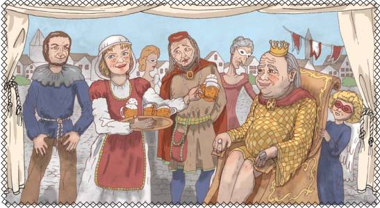 Постойте, а где же наша принцесса Альбертина? А вот и она в наряде дочери трактирщика обегает участников карнавала и ловко разносит угощения. И посмотрите, как она здорово управляется с подносом и кружками, словно настоящая дочь трактирщика! А почему бы на карнавале принцессе не стать дочерью трактирщика? Ведь она обычная девочка. Если ты хороший человек, то тебя будут любить даже в простом обличии.