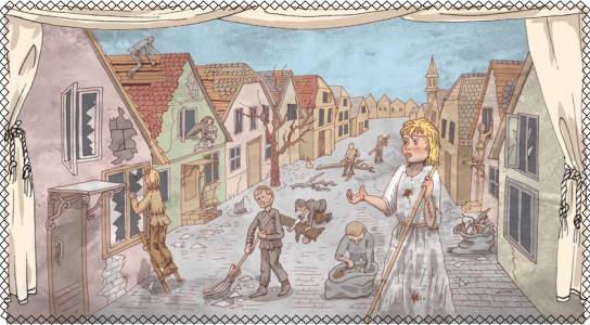 Когда шторм стих, вольный город Киль было не узнать. По улицам были разбросаны куски черепицы и стекла, камни и ветки. На месте парка лежали поваленные деревья. С испугом жители выглядывали из своих домов. И тут они увидели, как на Ратушную площадь вместе со стражником Йоханом пришла принцесса Альбертина. Она принесла веник, а стражник Йохан – мешок для мусора. Затем появилась Агнесс и вместе с принцессой они стали подметать Ратушную площадь, а стражник Йохан уносил собранный мусор на городскую свалку, что за Корабельной улицей. Видя это, горожане стали выходить из домов и помогать своей принцессе убирать вольный город Киль.