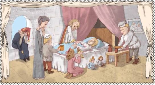 Принцесса Альбертина лежала в своей постели в королевском замке грустная и несчастная, с бледным лицом. Друзья старались её утешить. Маргрете принесла принцессе из леса земляничное варенье. Агнесса подарила ей свою лучшую куклу. Фрау Адалинда сшила принцессе красивые носовые платочки. Возле больной хлопотала заботливая фрау Аделите. Оба Гюнтера и фрау Матильда тоже были рядом и как могли старались облегчить страдания Альбертины. Кондитер Ральф не отходил от больной ни на шаг. А в городской кирхе за выздоровление принцессы молились монах Родерик и три фрейлины: Эмили, Катрин и Хильда.
