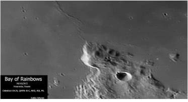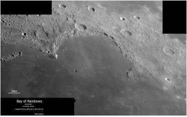 ЧТО ВИДНО В ТЕЛЕСКОПЫ С МАЛЫМ ДИАМЕТРОМ ОБЪЕКТИВА (70–100 ММ)?Телескопы с низким увеличением хорошо подходят для обзорного изучения наиболее крупных образований на Луне. Так, наблюдателю становятся доступны все моря и заливы, из числа которых сразу бросается в глаза Залив Радуги шириной около 160 км в Море Дождей.