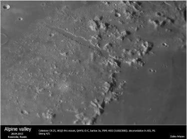 Пристального внимания заслуживает Альпийская Долина – так назвал ее первооткрыватель, итальянский священник и астроном Франческо Бьянкини в далеком 1727 году. С тех пор эта лунная достопримечательность приковывает к себе внимание не только ученых, но и любителей астрономии. Благодаря своим размерам (длина 160 км, ширина средней части 10 км) Альпийская Долина – один их самых легких для наблюдения лунных объектов. При удачном освещении этот разлом можно рассмотреть даже в 50-миллиметровый бинокль.