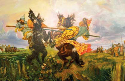 Перед битвой КуликовскойПо обычаю тех давних летДва всадника сходились в поединке,Готов был каждый умереть.Каждый ставил жизнь на кон,А ставка здесь дороже жизни.Бой скоротечен и жесток.Решенье, как в бессмертие прыжок.От русских вышел Пересвет,Посланец Сергия Святого.Боярин, воин, инок смирныйГотов принять удар неотвратимый!Дух его высок, спокоен,От любви к земле родной,А конь его, послушный воле,Нетерпелив и рвется в бой.Мысль его чиста, как первый снег,Он вспоминает дом родной,Луга в цвету и поле яровое,Где бегал с босоногой детворой.