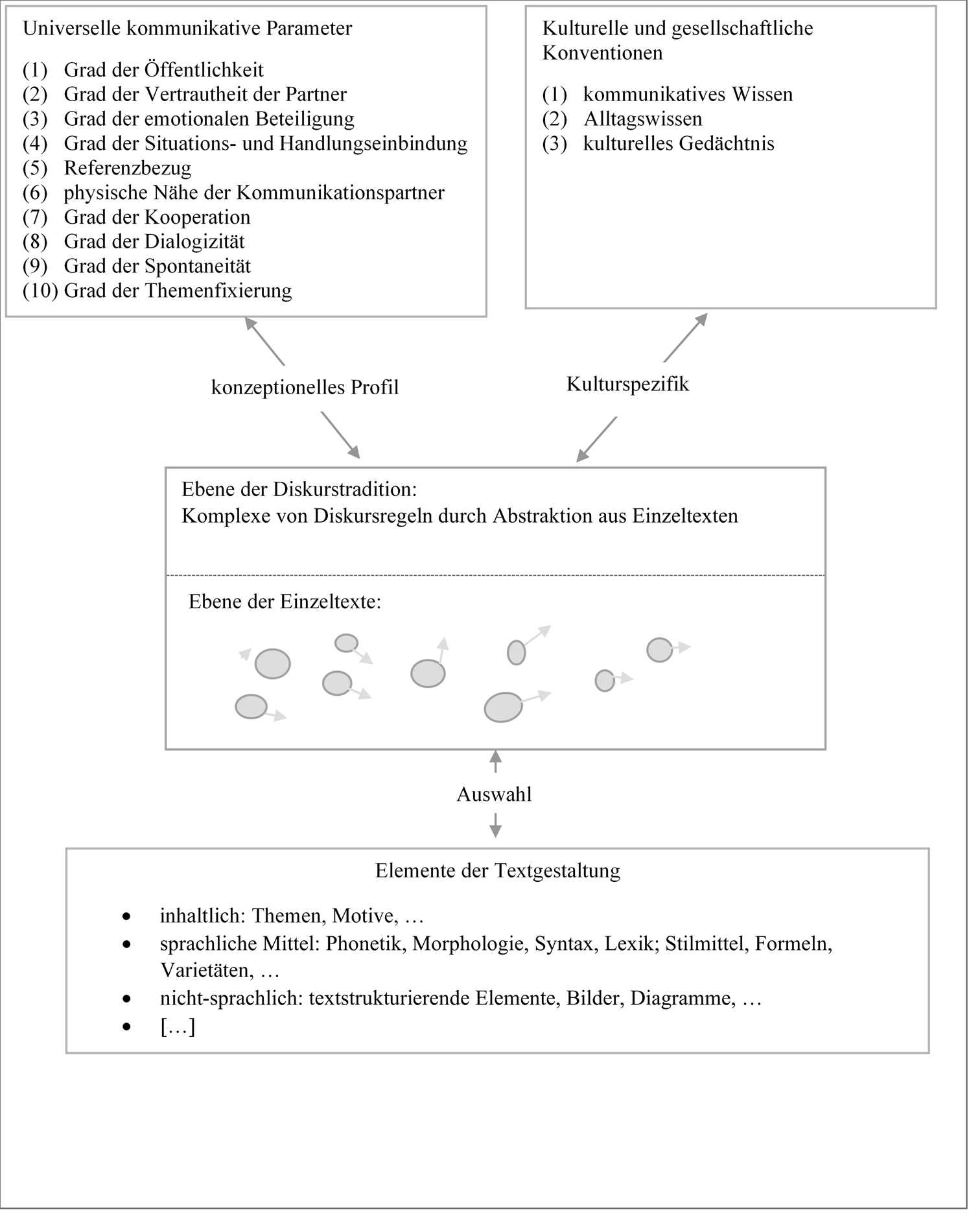 Diskurstraditionen stehen demnach in enger Verbindung zu universellen Parametern der Kommunikationssituation einerseits und zu gesellschaftlich-kulturellen Konventionen andererseits.