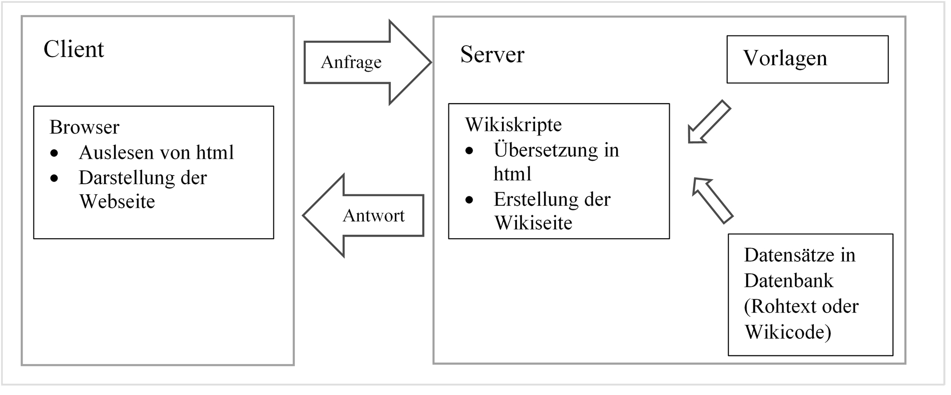 Wird eine Suchanfrage nach einer Wikiseite in den Browser des Clients eingegeben, so sendet dieser die Anfrage an den Server, einen Zentralrechner. Auf diesem ist die Wikisoftware in Form von Skripten installiert. Die Wikiskripte lesen nun die Daten aus der Datenbank aus, in denen die Inhalte in Form von Rohtext oder Wikicode enthalten sind. Die Wikiskripte übersetzen die Rohtextdaten in html und betten diese anhand der Formatvorlagen in eine Webseite ein. Die erstellte html-Seite wird an den Browser gesendet, der wiederum die html-Seite ausliest und für den Nutzer darstellt.