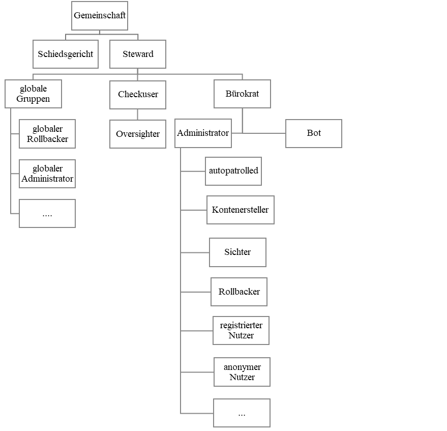Obwohl in Wikipedia jeder Nutzer einen Beitrag zu einem Artikel leisten kann, werden in der WikipediagemeinschaftWikipediagemeinschaft in hierarchischer Abstufung Rechte für weitere Tätigkeiten vergeben. Dadurch entstehen in der Nutzergemeinschaft unterschiedliche Statusgruppen, die im Benutzerkonto durch flags angegeben werden. Ein Organigramm der Wikimedia-Stiftung zeigt typische Statusgruppen, wobei die einzelnen Wikipediaausgaben geringfügige Abwandlungen dieser Struktur vornehmen (cf. außerdem WPF 2017: s.v. Aide:Statuts des utilisateurs; WPI 2017: s.v. Wikipedia:Livelli di accesso degli utenti zur näheren Beschreibung der Statusgruppen):