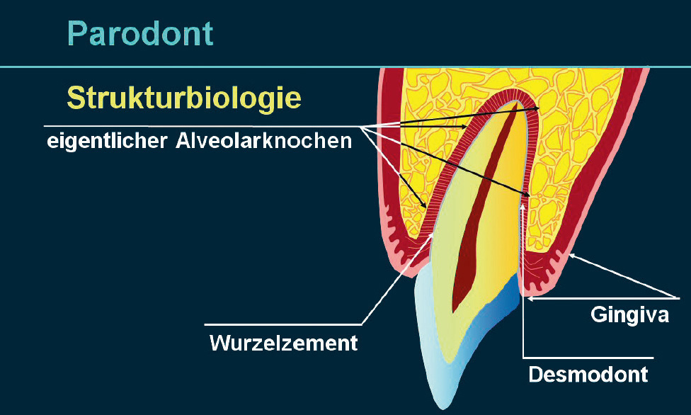 Anatomie des Parodonts1Die Zähne als solche bestehen zum einen aus Schmelz und Dentin und zum anderen aus dem das Pulpakavum ausfüllenden Pulpagewebe. Obwohl das Wurzelzement innig mit dem Dentin und z. T. der Schmelzoberfläche verbunden ist, stellt es definitionsgemäß einen Teil des Parodonts dar. Der Zahnhalteapparat, das Parodont, besteht aus vier Geweben: der Gingiva, dem Desmodont, dem Wurzelzement und dem Alveolarknochen. Der letztere besteht aus dem eigentlichen Alveolarknochen, der mit der Lamina cribriformis der Alveole gleichzusetzen ist, und dem Alveolarfortsatz (Abb. 1). Desmodont, Wurzelzement und eigentlicher Alveolarknochen entstammen als ektomesenchymale Gewebe dem Zahnsäckchen. Herkunftsmäßig ist Epithelgewebe uneinheitlich, da alle embryonalen Keimblätter in der Lage sind, Epithelgewebe zu bilden. Das Epithel der Mundschleimhaut ist zum Teil ektodermaler (Lippen, Vestibulum, Gingiva, Wangen, Gaumen, Mundboden) und zum Teil entodermaler (Zunge) Herkunft. Das Parodont verfügt über Rezeptoren, die Schmerz, taktile Reize und Druck übertragen. Die Funktion des Parodonts besteht zum einen darin, den Zahn im Kiefer zu verankern und zum anderen das aseptische Ökosystem der inneren Gewebe von der bakteriell kontaminierten Mundhöhle abzuschirmen1,2.
