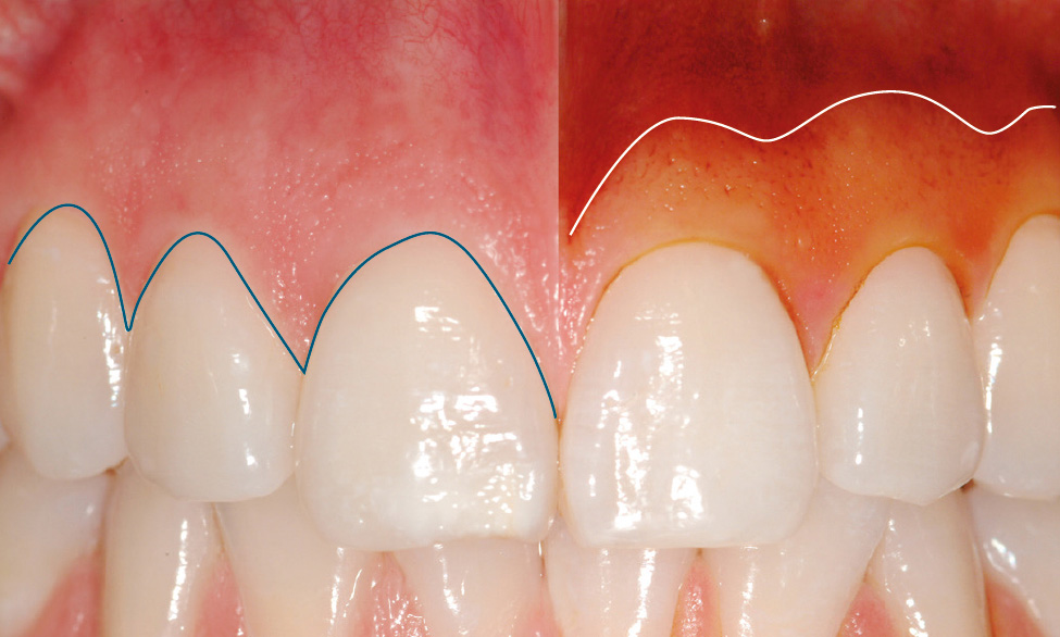 Abb. 2 Gesunde Gingiva. Die Gingiva wird koronal durch den Gingivasaum (Limbus gingivae, blaue Linie) begrenzt und geht vestibulär an der mukogingivalen Grenze (Linea girlandiformis, weiße Linie) in die Alveolarmukosa über. Die mukogingivale Grenze kann mithilfe Schiller‘scher Jodlösung dargestellt werden.