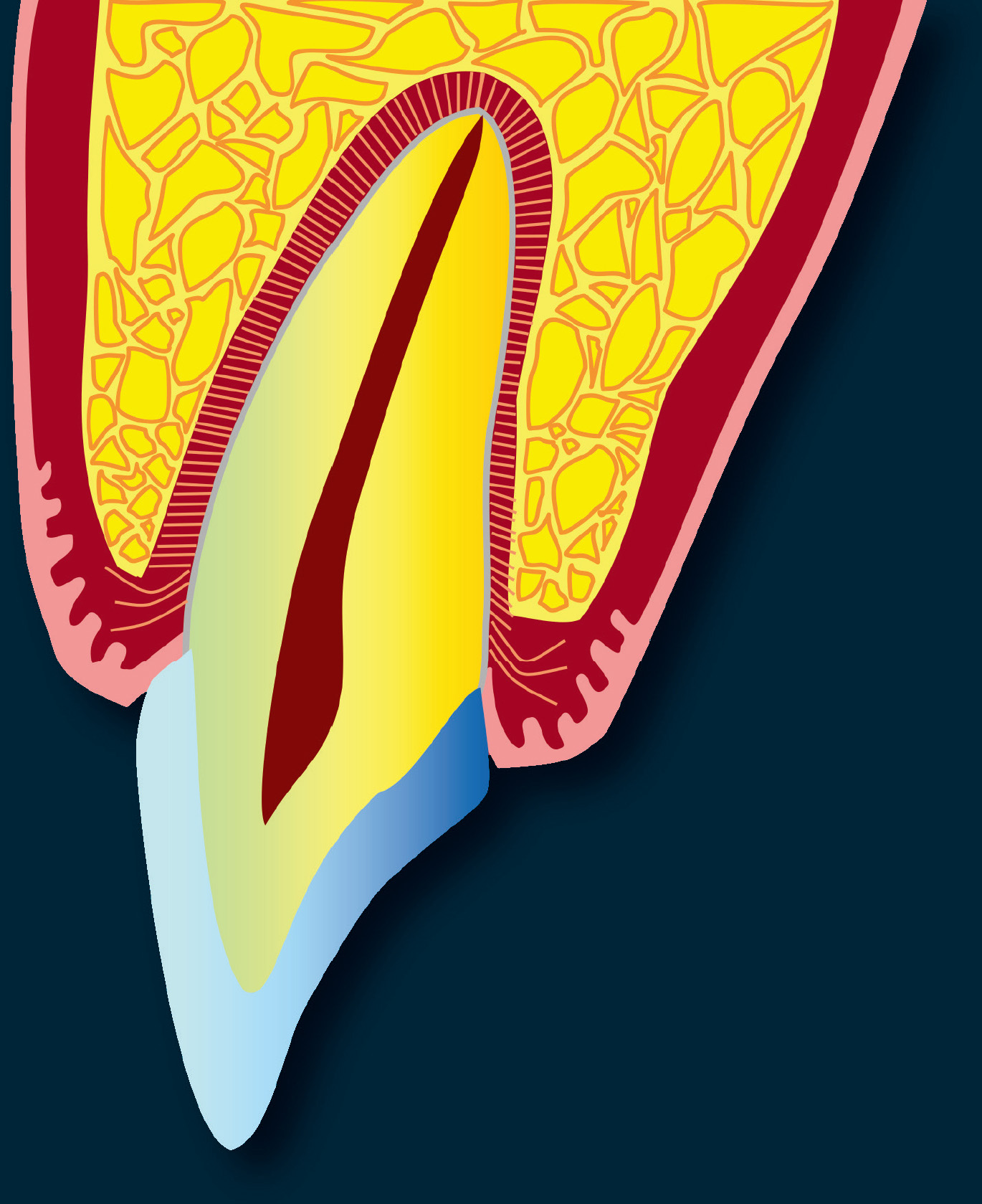 Abb. 1 Das Parodont als funktionelle Einheit besteht aus vier Geweben: der Gingiva propria, dem Desmodont, dem Wurzelzement und dem eigentlichen Alveolarknochen, der mit der Lamina cribriformis der Alveole gleichzusetzen ist.