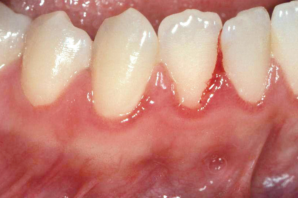 Abb. 7 Klinisch manifeste plaqueinduzierte Gingivitis: interdental oraler Biofilm. Der Gingivarand ist ödematös und gerötet, ein Stippling ist nicht zu erkennen, die Interdentalpapillen sind geschwollen, approximal der Zähne 41 und 42 tritt eine Spontanblutung auf1.