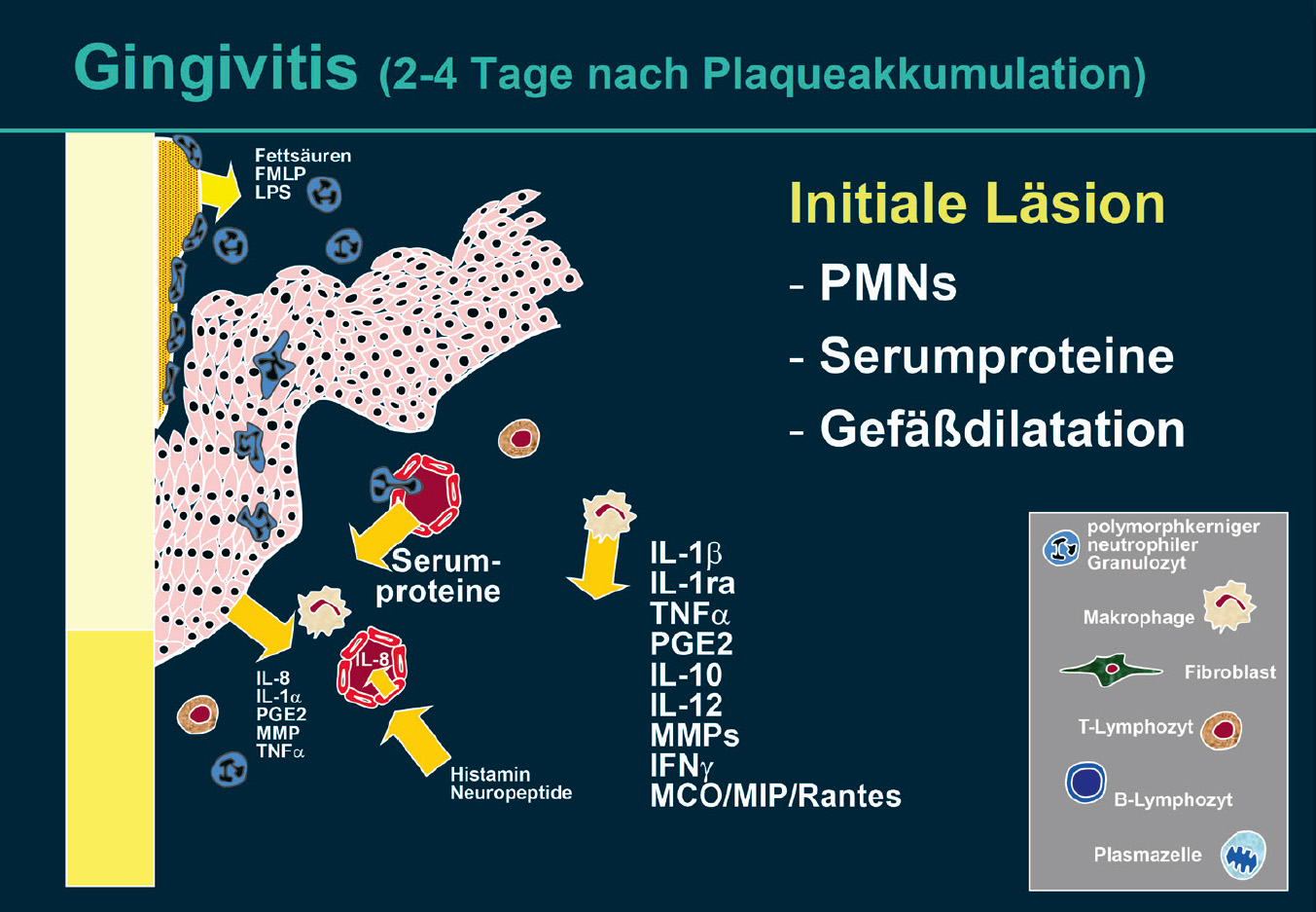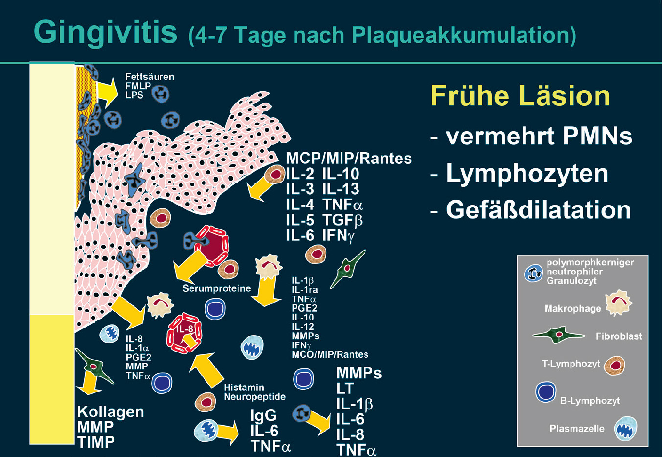 Durch Zytokine erhöht sich die Zahl der Lymphozyten, die in der frühen Läsion zusammen mit neutrophilen Granulozyten die vorherrschende Gruppe von Leukozyten darstellen, während nur wenige Plasmazellen vorhanden sind. Das Infiltrat nimmt in der frühen Läsion etwa 15 % des Volumens des gingivalen Bindegewebes ein.