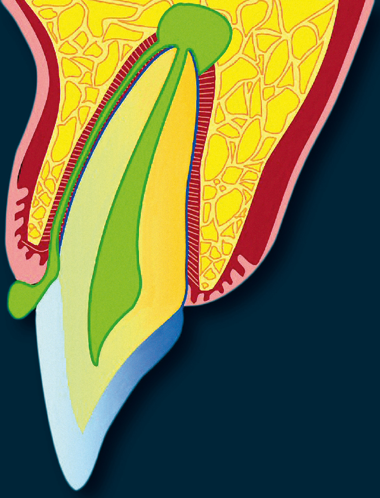 Die Proliferation des Saumepithels mit Ausbildung von Retezapfen nimmt zu und es geht Kollagen verloren. Der das Infiltrat begrenzende Anteil des Epithels ist nun dünner und fragiler als das Saumepithel und bildet kein epitheliales Attachment zur Zahnoberfläche aus7. Dieses Taschenepithel weist einen hohen Anteil in die Tasche wandernder Leukozyten auf. Es weist eine höhere Permeabilität als das Saumepithel auf und kann an einzelnen Stellen vorübergehend ulzerieren.