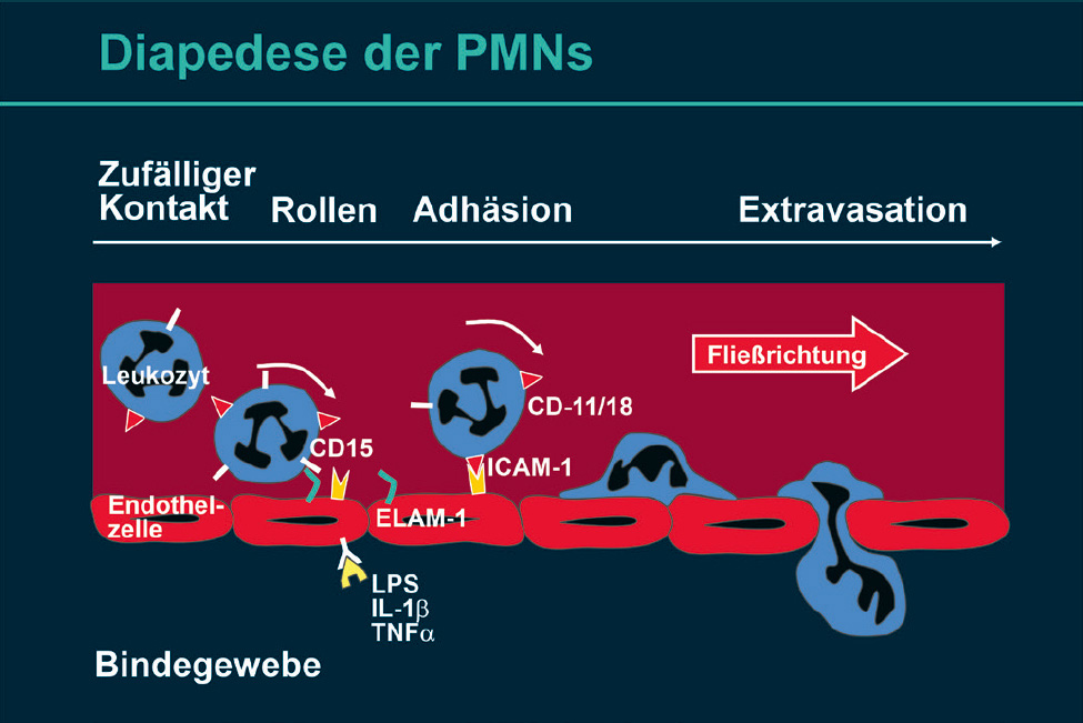 Abb. 4 Diapedese der Leukozyten: Die Endothelzellen der Venolen werden durch Lipopolysaccharide (LPS), Interleukin-1β (IL-1β) und Tumornekrosefaktor-α (TNF-α) aktiviert und exprimieren „Endothelial Leukocyte Adhesion Molecule-1“ (ELAM-1). Leukozyten exprimieren Sialy-Lewis-X, das eine lose Bindung mit ELAM-1 eingeht und so zu einer Verlangsamung der Leukozytenbewegung führt. Die resultiert in einer rollenden Bewegung entlang der Epitheloberfläche. Leukozytäre Anheftungsrezeptoren (CD11/18) bilden dann eine feste Bindung zum „Intercellular Adhesion Molecul-1“ (ICAM-1) aus (Adhäsion). Dies veranlasst den Durchtritt der Leukozyten zwischen den Endothelzellen nach extravaskulär (Extravasation) (modifiziert nach Kornman et al.4).