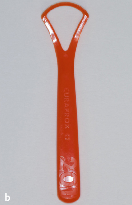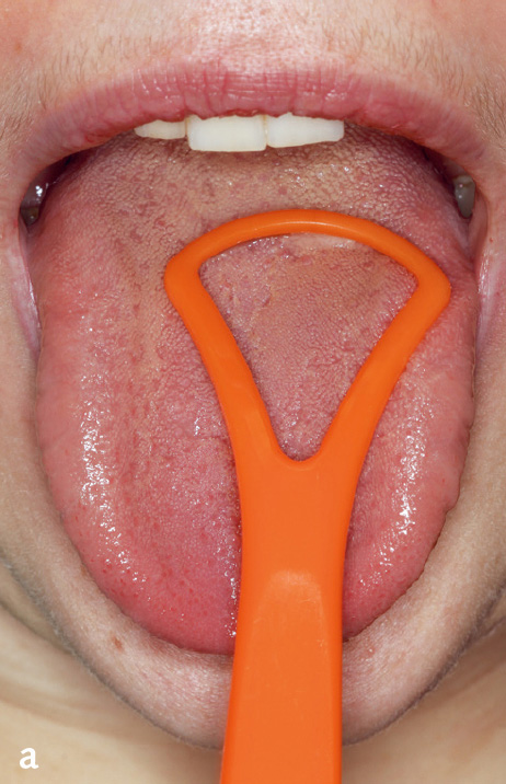 Der Aufbau der Zunge ist weitaus komplexer als er im Rahmen dieses Glossars beschrieben werden kann. Deshalb ist es nicht verwunderlich, dass es zu Abweichungen von der normalen Anatomie kommen kann. Diese Variationen müssen keinen Krankheitswert besitzen, können aber neben einer pathologischen Veränderung auch Ausdruck allgemeinmedizinischer Erkrankungen sein9. Therapeutische Ansätze, wie beispielsweise der Einsatz eines Zungenschabers (Abb. 3a und b), sind oftmals symptombezogen oder bei exogen verursachenden Faktoren streng ursachenbezogen2. Für detailliertere Ausführungen wird auf die Bücher von Filippi5 und Bork10 verwiesen.