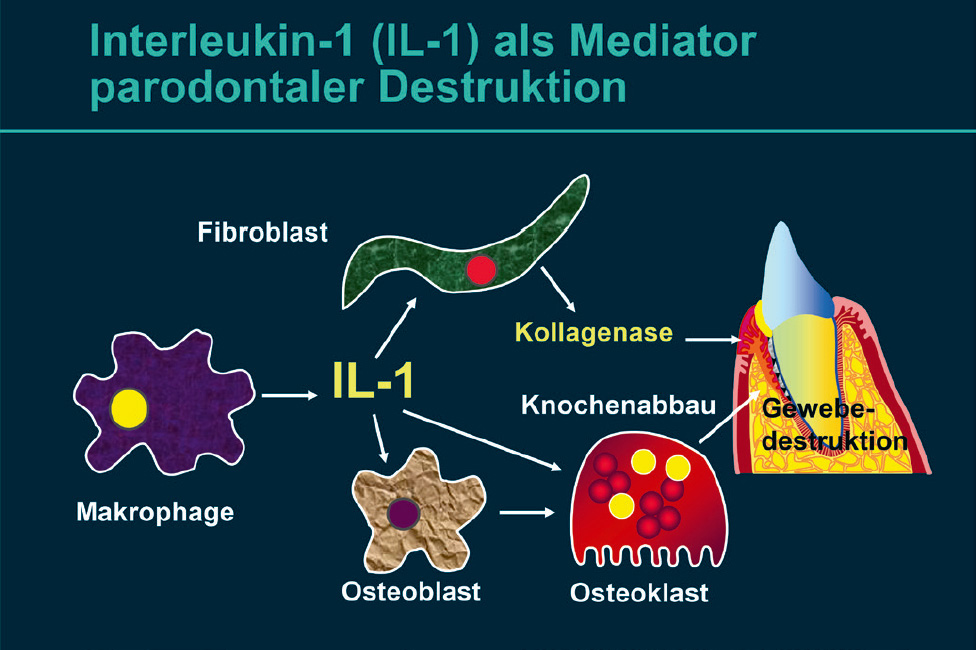 Abb. 6 Interleukin-1β (IL-1β) als Mediator parodontaler Destruktion: IL-1 wird von, durch entzündliche Reize aktivierten Makrophagen und Fibroblasten freigesetzt. Es induziert die Produktion von Matrix-Metalloproteinasen (z. B. Kollagenase) durch Fibroblasten, stimuliert die Osteoklasten und hemmt Osteoblasten, was schließlich zur Gewebezerstörung führt.