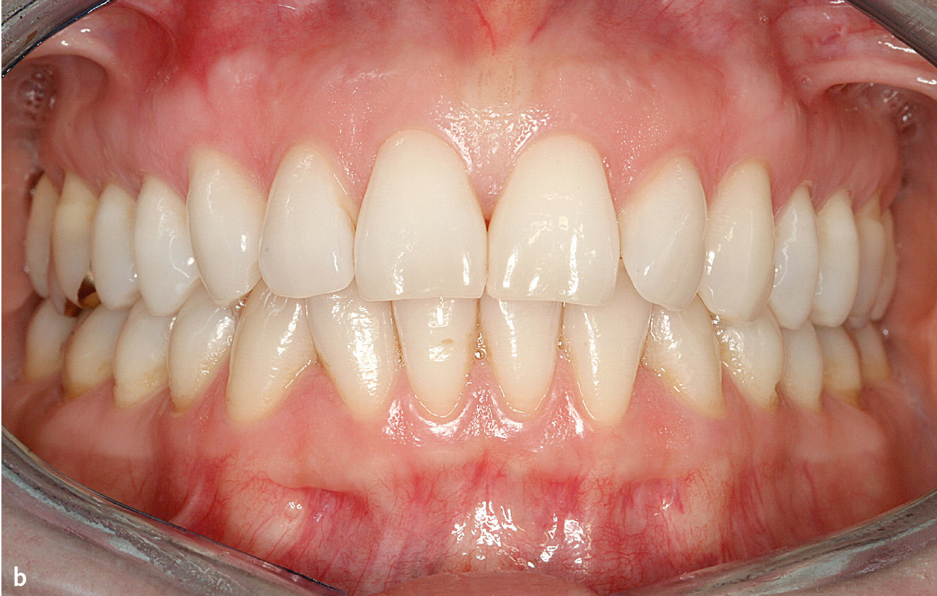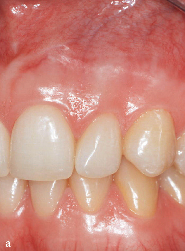 Abb. 1a und b Klinisch entzündungsfreie Gingiva: a) Frau im Alter von 24 Jahren, b) Frau im Alter von 41 Jahren.