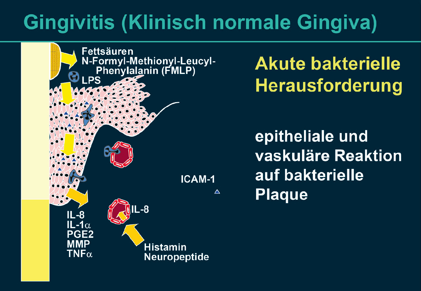 Die Umsatzrate des Saumepithels ist generell hoch und seine Zellen sind durch weniger Desmosomen verbunden als andere orale Epithelien. Eine verstärkte bakterielle Exposition erhöht diese Umsatzrate, die Interzellularräume weiten sich und ermöglichen somit einen verstärkten Ausstrom von Sulkusflüssigkeit sowie Leukozytenmigration. Die initiale Läsion zeigt bereits 24 Stunden nach Beginn der Plaqueakkumulation eine Dilatation der Gefäße des dentogingivalen Plexus. Es wird direkt benachbart zum Saumepithel vermehrt Blut in den mikrovaskulären Plexus gebracht. Der hydrostatische Druck wird erhöht und es öffnen sich Spalten zwischen den Endothelzellen der Kapillaren. Die Gefäßpermeabilität erhöht sich, sodass es zur Exsudation von Flüssigkeit und Proteinen in das Gewebe kommt (Abb. 3). Die Folge ist eine vermehrte Exsudation von Sulkusflüssigkeit. Durch die Exsudation ins Gewebe und den Sulkus können schädigende Substanzen mikrobiellen Ursprungs verdünnt werden. Bakterien und deren Produkte werden aus dem Sulkus hinausgespült. Die Menge der exsudierten Sulkusflüssigkeit (Sulkusflüssigkeitsflussrate) ist proportional zum Schweregrad der Entzündungsreaktion. Parallel mit den Gefäßveränderungen kommt es nach 2 bis 4 Tagen zu einer vermehrten Migration von neutrophilen Granulozyten und Monozyten/Makrophagen aus dem subepithelialen Gefäßplexus durch das subepitheliale Bindegewebe (s. Abb. 3). Adhäsionsmoleküle wie das „Intercellular Adhesion Molecule-1“ (ICAM-1) und das „Endothelial Leukocyte Adhesion Molecule-1“ (ELAM-1), die durch proinflammatorische Zytokine (Interleukin-1β [IL-1β], Tumornekrosefaktor-α [TNF-α]) aktiviert wurden, ermöglichen den Leukozyten, sich an der Gefäßwand der postkapillären Venolen anzuheften, um dann hindurchzutreten (Diapedese). Die vermehrte Extravasation der Leukozyten erfordert eine erhöhte Anheftungsrate dieser Zellen an die Gefäßwände. Proinflammatorische Stimuli (Lipopolysaccharide [LPS], IL-1β, TNF-α) führen nicht nur zu erhöhter Gefäßpermeabilität und Expression von Leukozytenadhäsionsmolekülen, sondern auch zur Ausschüttung anderer proinflammatorischer Zytokine, wie IL-8, in die Blutbahn, durch die ein Rollen der Leukozyten induziert wird. Damit erhöht sich die Wahrscheinlichkeit eines Kontaktes zwischen Leukozyten-Integrinen und Endothelzelladhäsionsmolekülen (z. B. ICAM-1) (Abb. 4).