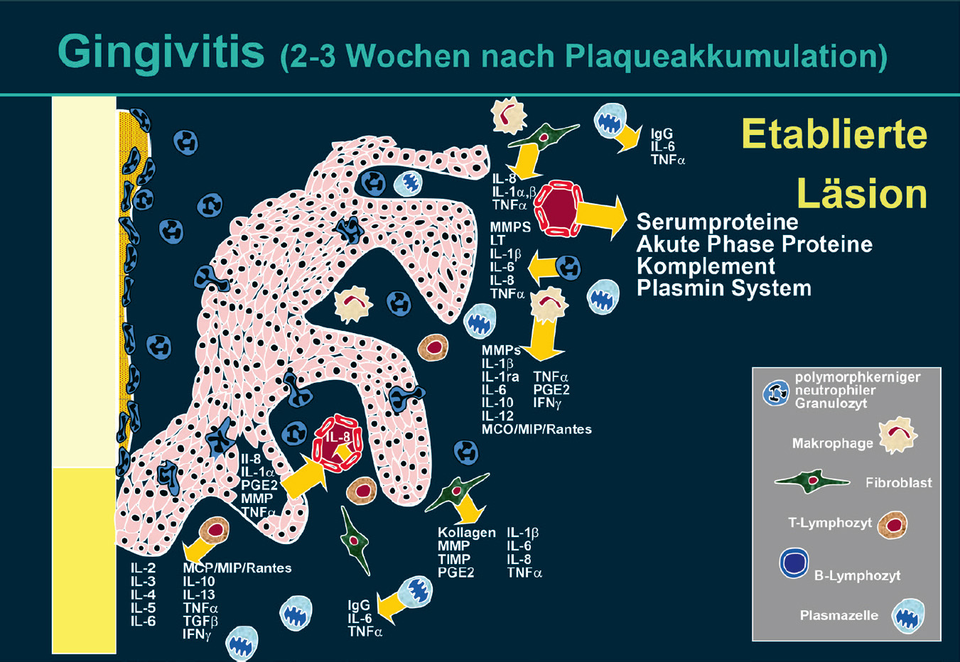 Abb. 5 Frühe Läsion: Zusätzlich zur in Abb. 3 dargestellten Aktivierung von Serumproteinen und Makrophagen erscheinen B- und T-Lymphozyten sowie Plasmazellen. Aktivierte T-Lymphozyten produzieren Zytokine wie Interleukin-2 (IL-2), IL-3, -4, -5, -6, -10 und -13 sowie Tumornekrosefaktor-α (TNF-α), Transformierender Wachstumsfaktor β (TGF-β), Interferon-γ (IFN-γ) und Chemotaxine wie Monozyten-Chemotaxis-Protein (MCP), Makrophagen-inflammatorisches Protein (MIP), „regulated on activation, normal T-cell expressed and secreted“ (RANTES). Plasmazellen treten vermehrt im Gewebe auf und produzieren Immunglobuline (z. B. IgG) und Zytokine (z. B. IL-6, TNF-α). Einige der neutrophilen segmentkernigen Granulozyten (PMN) im Gewebe werden aktiviert und setzen IL-1α, -1β, -6, -8, TNF-α, Leukotriene (LT) und Matrix-Metalloproteinasen (MMP) frei. Fibroblasten produzieren Kollagen, MMP und Gewebeinhibitoren der MMPs (TIMP). N-Formyl-Methionyl-Leucyl-Phenylalanin (FMLP), Lipopolysaccharide (LPS), Prostaglandin E2 (PGE2) (modifiziert nach Kornman et al.4).