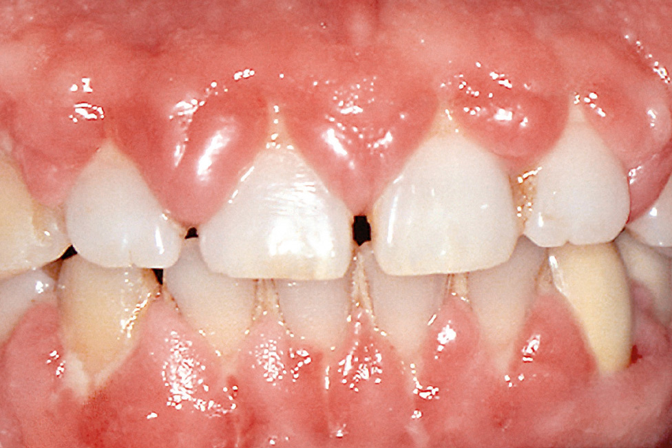 Die Gingivavergrößerung ähnelt klinisch und histologisch der hydantoininduzierten Wucherung und manifestiert sich am ausgeprägtesten im Bereich der labialen Papillen (Abb. 5). Die Veränderungen bilden sich nach Absetzen des Medikaments häufig wieder zurück. Durch eine regelmäßige Entfernung der Plaque ist es möglich, das Ausmaß der Wucherung deutlich zu reduzieren und oft auch vollständig zu eliminieren.