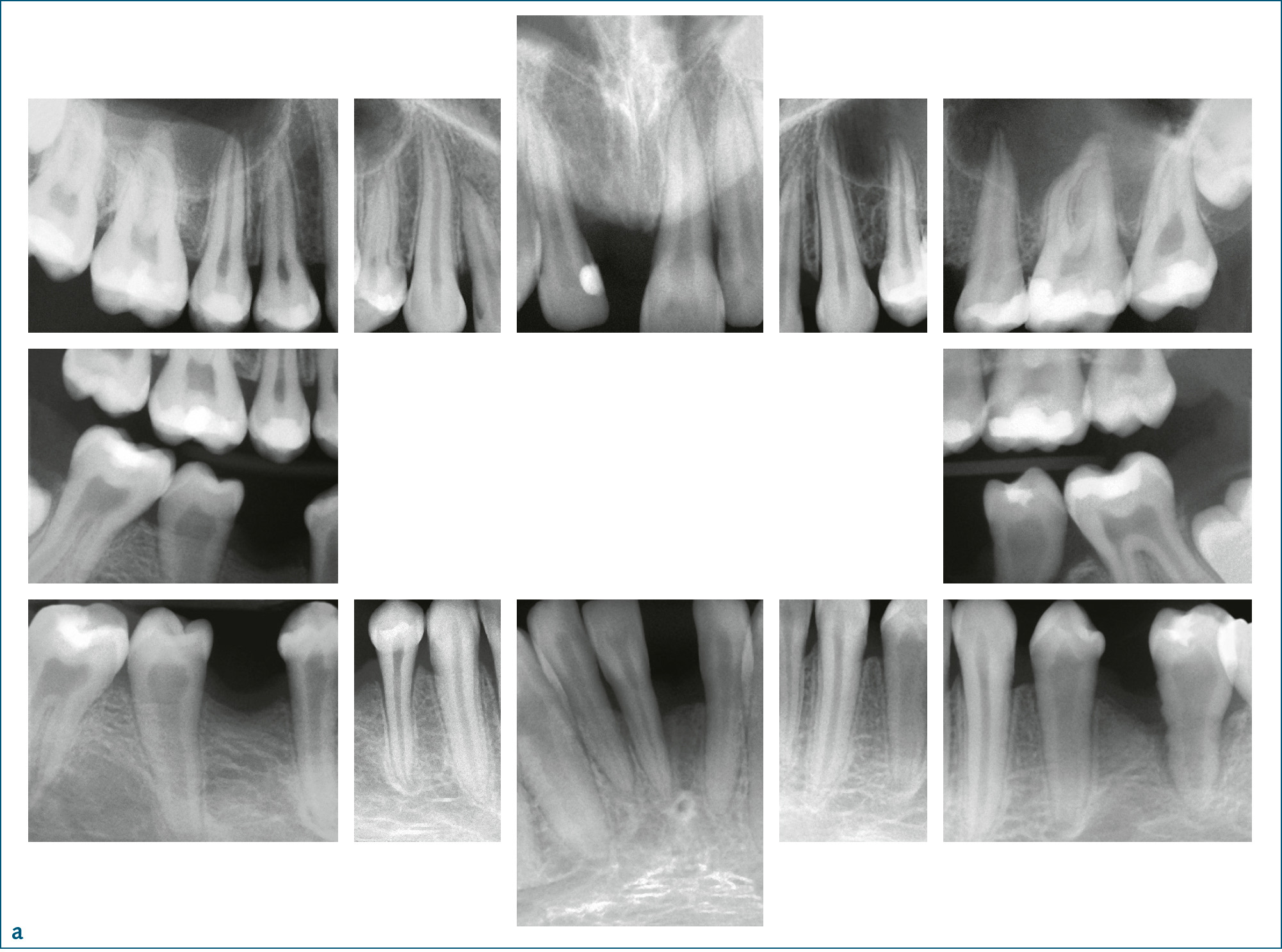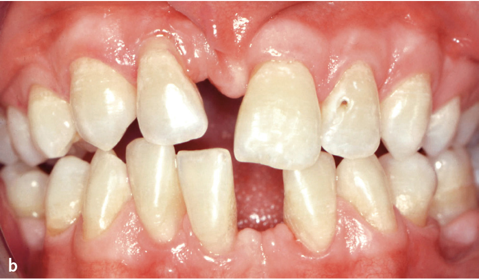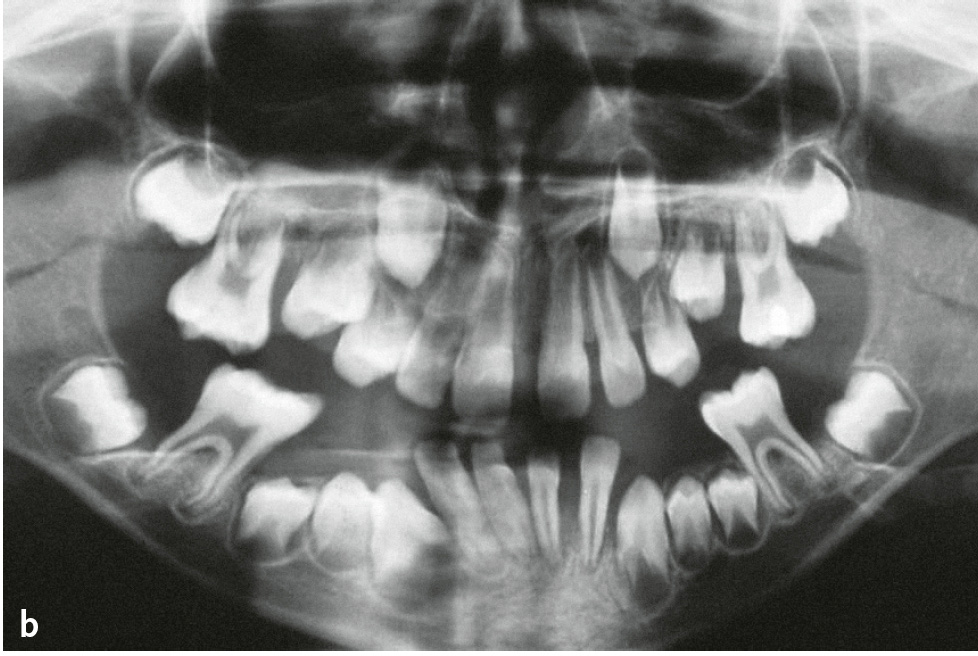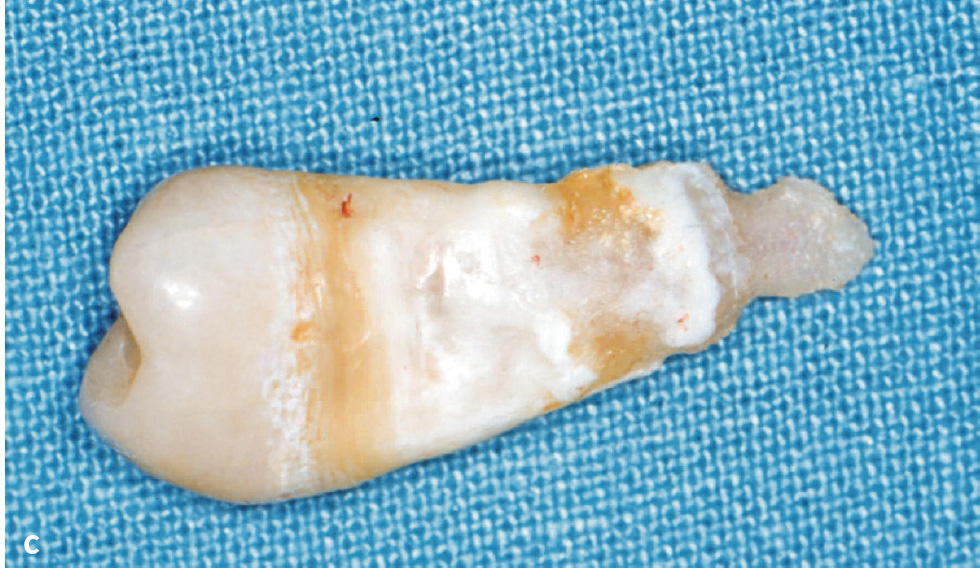 Abb. 2a bis c 14-jähriger männlicher Patient mit Kindheits-Hypophosphatasie. Die Beweglichkeit der Schultergelenke ist eingeschränkt und der Patient ist von kleiner Statur. Anamnestisch ergibt sich ein vorzeitiger Verlust der Milchzähne: a) Röntgenstatus: Die Zähne 11, 31 und 46 fehlen, es finden sich zahlreiche Restaurationen (Kariesvorgeschichte) und große Pulpakammern. Bei den Ober- und Unterkieferschneidezähnen und bei 35 zeigt sich Knochenabbau bis ins mittlere Wurzeldrittel. Die Wurzeloberfläche von 35 erscheint unregelmäßig; b) klinische Ansicht; c) Zahn 35 nach Extraktion aufgrund eines Parodontalabszesses: unregelmäßige, atypische Wurzeloberfläche.