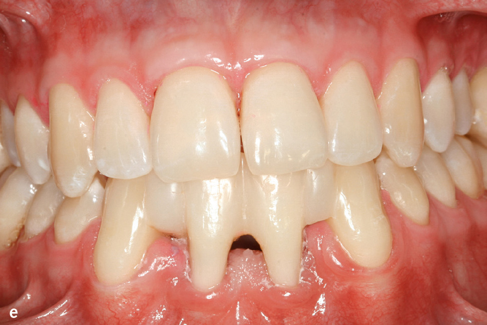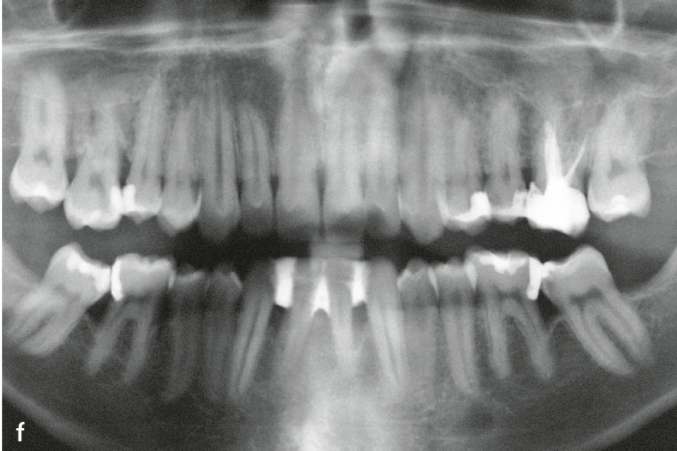 Abb.1e und f e) Klinische Ansicht im Alter von 22 Jahren; 14 Jahre nach nichtchirurgischer antiinfektiöser Therapie mit unterstützender Gabe von Amoxicillin und Metronidazol und anschließender unterstützender Parodontitistherapie anfänglich alle 2, später alle 3 Monate; f) Panoramaschichtaufnahme zu Abb. 1e.