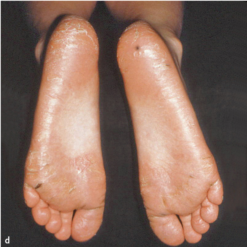 Abb. 1a bis d Männlicher Patient mit Papillon-Lefèvre-Syndrom: a) klinische Ansicht im Alter von 7 Jahren und 9 Monaten (vor Therapie: ausgeprägte Mobilität der Unterkieferschneidezähne, Sondierungstiefen an ersten Molaren und Unterkieferschneidezähnen von 9 bis 15 mm); b) Panoramaschichtaufnahme; Hyperkeratosen an c) Hand- und d) Fußflächen (Abbildungen aus Kugel et al. 20015).