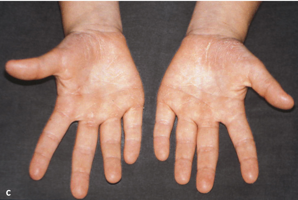Das Haim-Munk-Syndrom (HMS; Keratosis palmoplantaris – Parodontopathie – Onychogryphosis, Keratosis palmoplantaris diffusa mit Periodontopathie, Palmoplantarhyperkeratose – Parodontopathie – Onychogryphosis; ORPHA2342/ICD-10: Q82.8) ist ein weiteres autosomal-rezessiv vererbbares Syndrom, das bisher in einer jüdischen Bevölkerungsgruppe in Indien und Israel beschrieben wurde. Mit palmoplantaren Hyperkeratosen und früh beginnender sowie sehr rasch verlaufender Parodontitis ist es dem Papillon-LefèvreSyndrom ähnlich. Es zeigen sich allele Mutationen des Kathepsin-C-Gens. Weitere Symptome sind Hypertrophie und Krümmung der Nägel (Onychogryphose), Plattfüße (pes planus), Arachnodaktylie und Osteolyse der distalen Phalangen der Finger sowie Zehen (Akroosteolyse). Die Unterscheidung zwischen Papillon-Lefèvre- und Haim-Munk-Syndrom ist schwierig und setzt die Berücksichtigung der skelettalen Symptome von HMS voraus8.