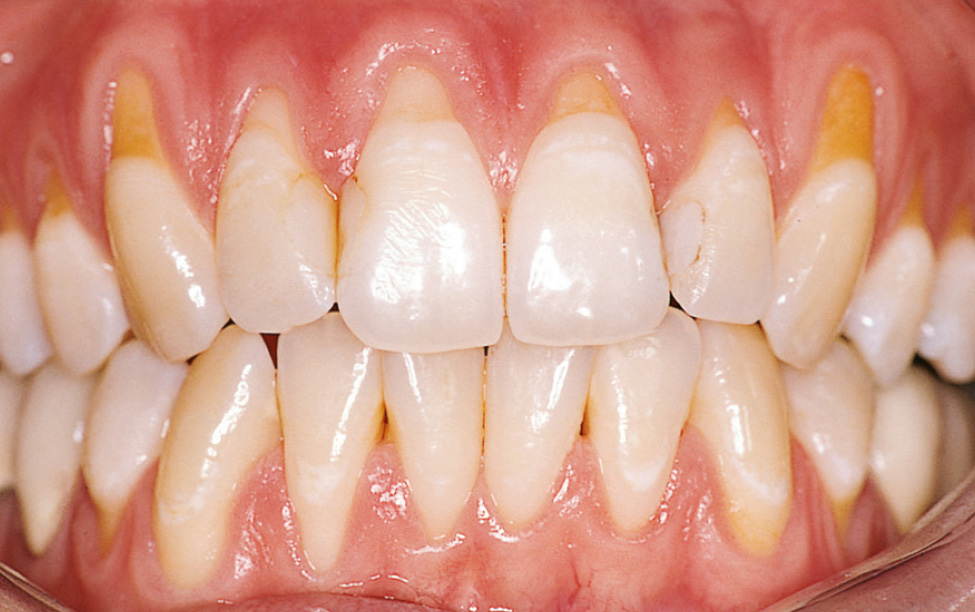 Abb. 2 Zustand 2 Jahre nach systematischer Therapie einer generalisierten Parodontitis (Stadium III, Grad C) bei einer 50-jährigen Patientin: Im Oberkiefer und im Unterkieferfrontzahnbereich liegen zirkulär die Zahnhälse frei (gingivale Rezessionen RT2 und RT3).