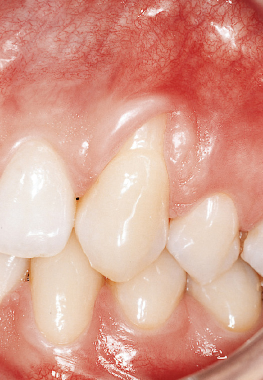 Abb. 6 Faziale Rezession am Zahn 23 mit schmalem Band keratinisierter Gingiva und horizontalen Rillen auf dem freiliegenden Zahnhals. Am Zahn 24, der keine Rezession aufweist, findet sich ein deutlich breiterer Saum keratinisierter Gingiva. Es ist sehr wahrscheinlich, dass am Zahn 23 vor Entstehung der Rezession ein ähnlich breiter Saum keratinisierter Gingiva existierte.