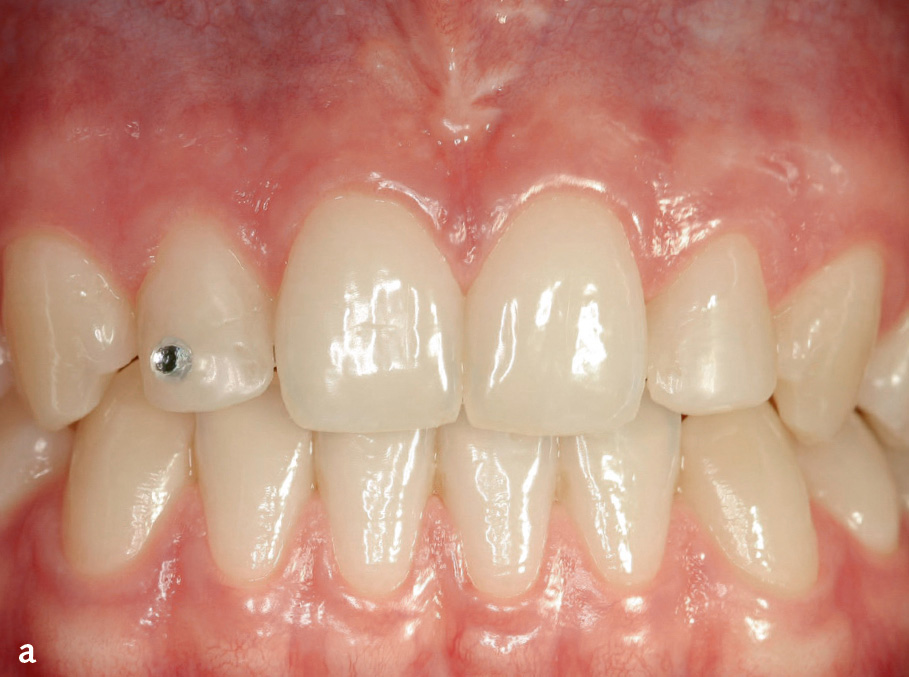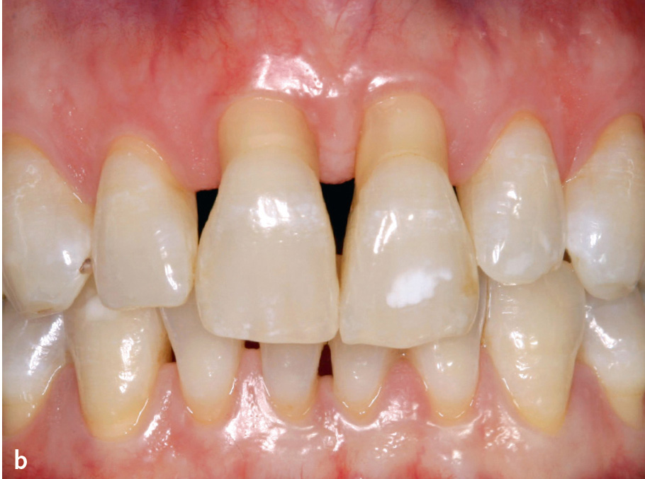 Abb. 8 Faziale Rezessionen an den Zähnen 31 und 41 bei einer Patientin während einer kieferorthopädischen Therapie.