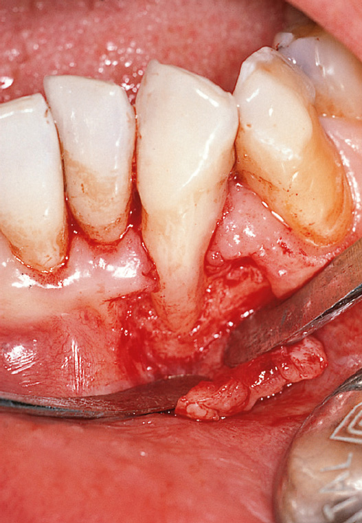 Abb. 4 Intraoperative Ansicht einer knöchernen Dehiszenz bukkal von Zahn 32 am Boden einer Rezession vom Typ RT2.