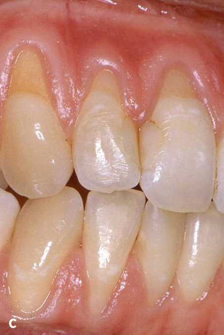 Abb. 3a bis c a) Gesundheit im intakten Parodont; b) bei stabilem Zustand nach erfolgreicher Parodontitistherapie; c) im reduzierten Parodont, das nicht durch Parodontitis (hier: Rezessionen) verursacht wurde8.